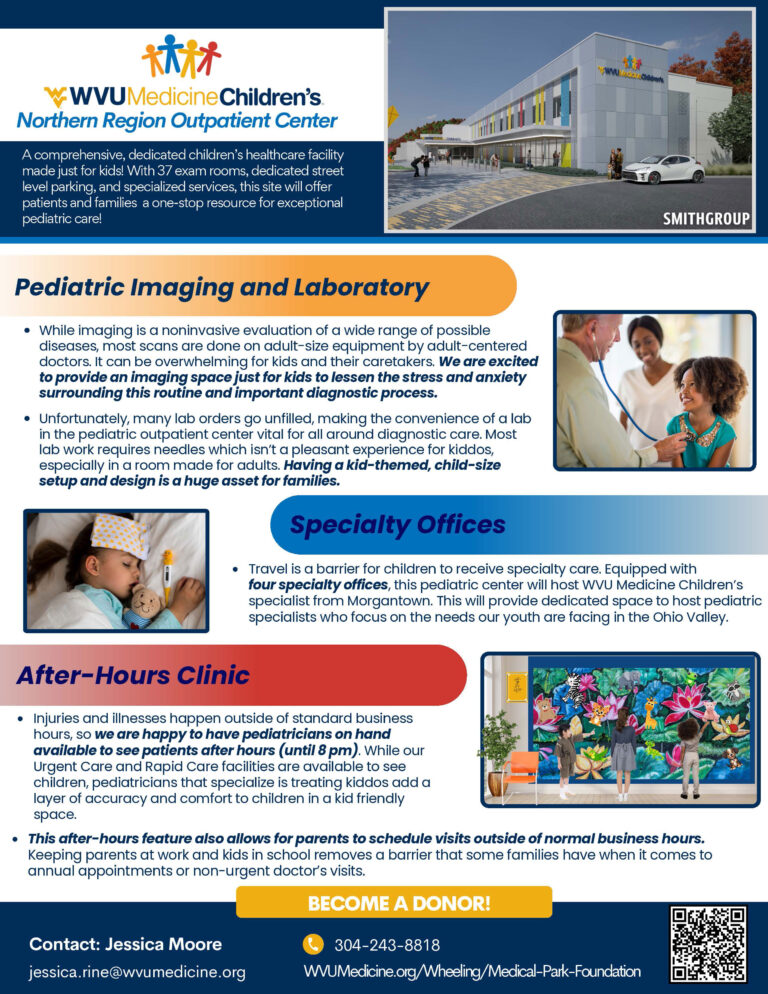 The Medical Park Foundation’s mission is to locate financial support through community focused companies, organizations and individuals, to support the health care projects at WVU Medicine Wheeling Hospital. Your support will help us continue to grow services and programs throughout the hospital. We value relationship building within our community partners, staff, patients, and their families. Together, we will identify and eliminate barriers to care in our community.