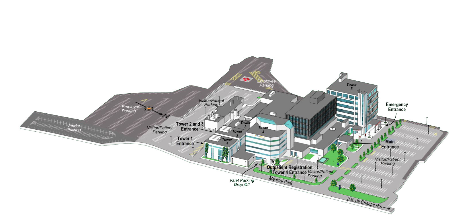The primary parking lot is located directly in front of the hospital. This lot is ideal for patients visiting the main building, Tower 4, Tower 5, or the Emergency Department. Additional parking lots are available behind the hospital with access to Towers 1, 2, and 3.