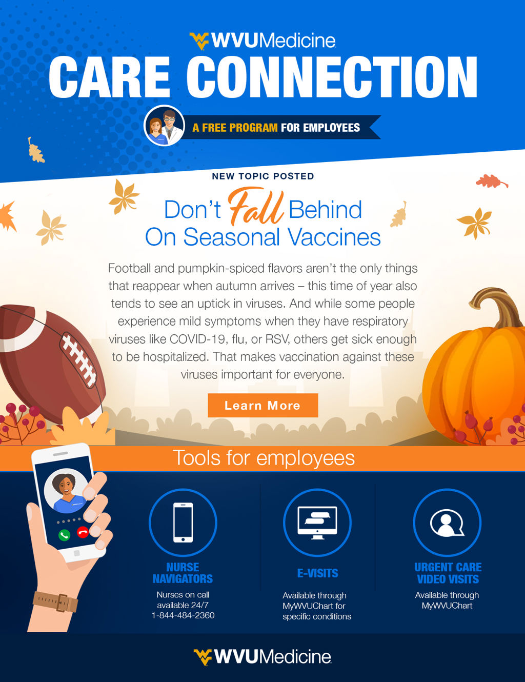 All WVU Medicine employees are required to get a flu vaccine by Wednesday, Nov. 29 (unless they have an approved medical or religious exemption), and you can check with your local hospital for more details about this year’s flu vaccine campaign. If you have questions about receiving a COVID-19 or RSV vaccine, which are not currently required for employees, check with your local hospital, pharmacy, or primary care provider.