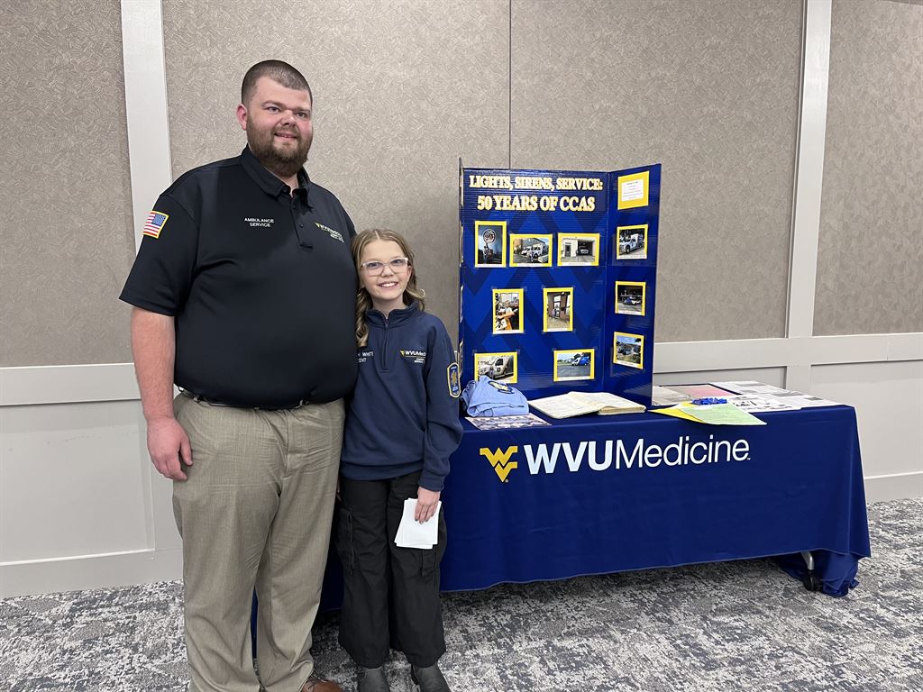 Camden Clark EMS Shift Coordinator Tyler White is pictured with his daughter, Sydneigh White, a 10-year-old student at Creed Collins Elementary School in Pennsboro. Sydneigh recently earned first place at the regional social studies fair for her project on the history and 50th anniversary of the Camden Clark Ambulance Service, which was also on display during the celebration.